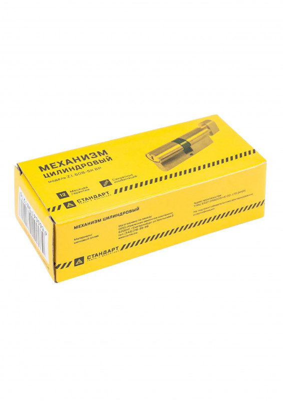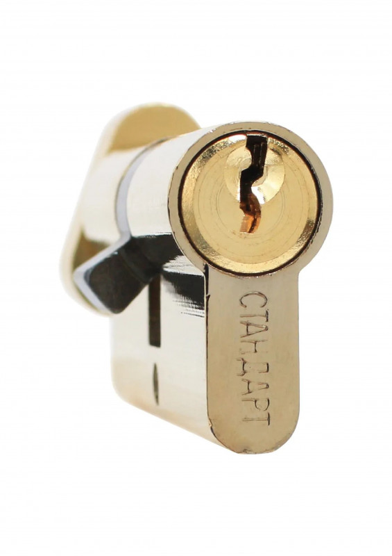 Цилиндровый механизм Стандарт устанавливается вместе с врезным замком. Запирание осуществляется с помощью английского ключа, который идет в комплекте в количестве 5 штук. Кулачок механизма выдвинут на 30 градусов от плоскости, что препятствует выбиванию цилиндра из двери.