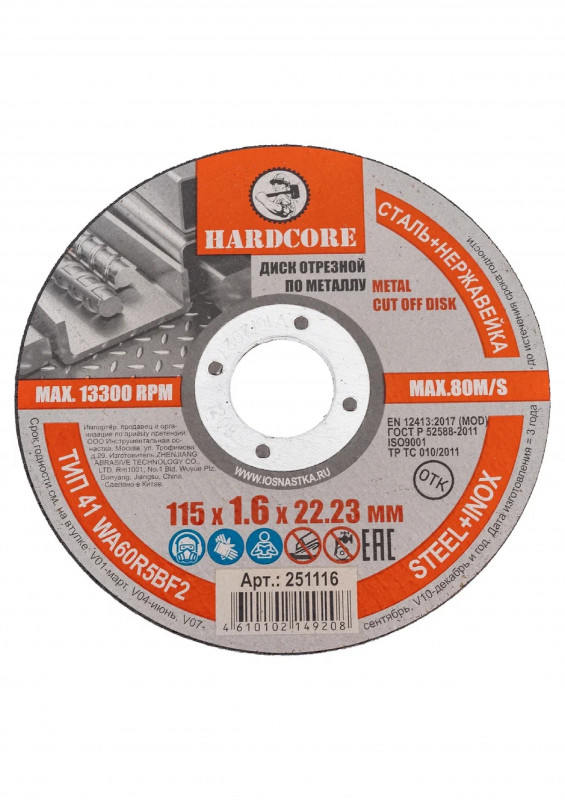 Профессиональное качество дисков, высокая производительность и длительный ресурс. Диски Хардкор произведены на крупнейшем заводе с 30 летним опытом по производству дисков для резки металла, с использованием высококачественной продукции и передовых технологий в производстве. Поставки клиентам по всему миру, включая Германию и другие страны Европы.