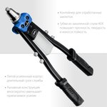 Применяется для установки нержавеющих, стальных и алюминиевых вытяжных заклепок. Способ применения: 1. Просверлите отверстие 2. Установите заклепку в заклепочник, а затем в отверстие 3. Сжимайте и разжимайте рукоятки заклепочника до момента откусывания хвостовика заклепки 4. Заклепка установлена